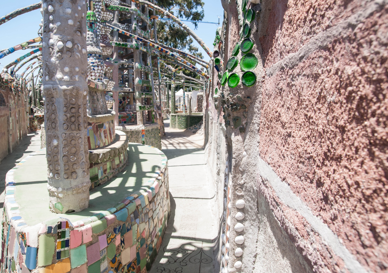 They are considered one of the finest examples of American “Naive” art — constructed with found objects such as green soda bottles, blue Milk of Magnesia bottles, and damaged Malibu pottery. Rodia called his creation Nuestro Pueblo — or “Our Town.”